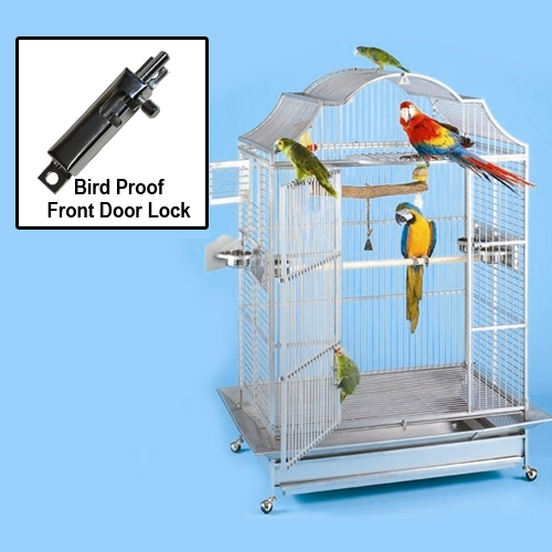 I prefer their stainless steel over their powder coated, but would suggest having it made and weld together rather than using their pins (unless they have improved the quality of those Lexan pins, they break easily). A con would be their proprietary feeding dishes and unless they changed the design the whole cage can be lifted and removed by your bird. A plus the front door latch (my Moluccan has never opened it!).